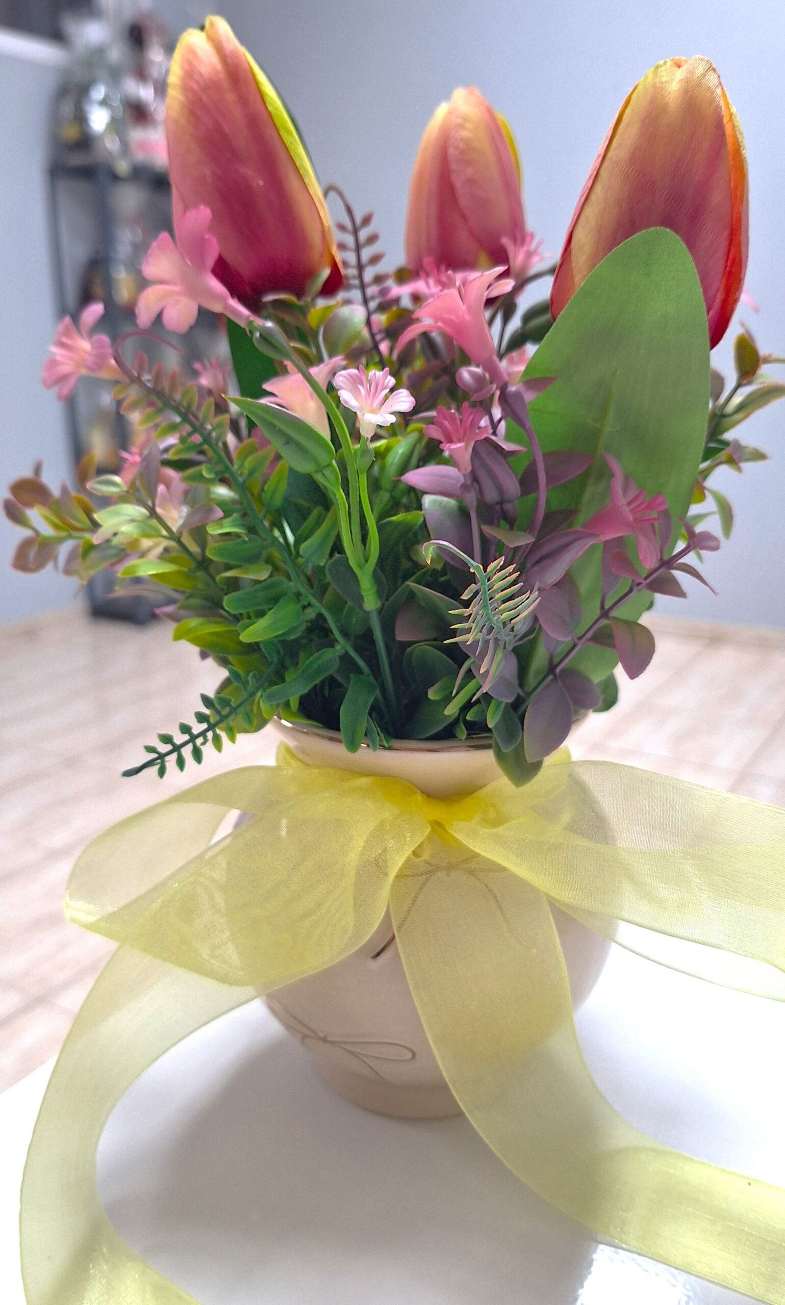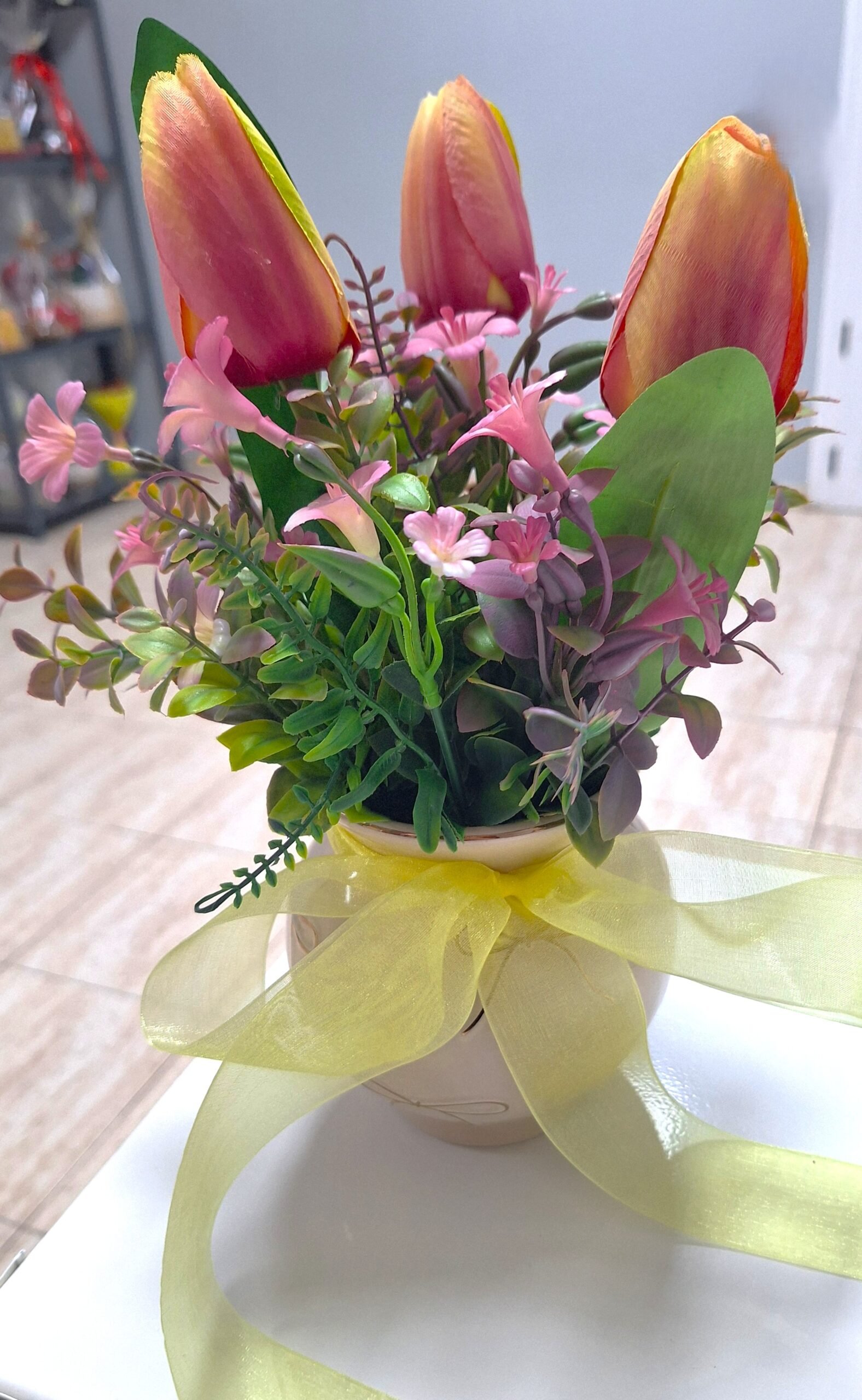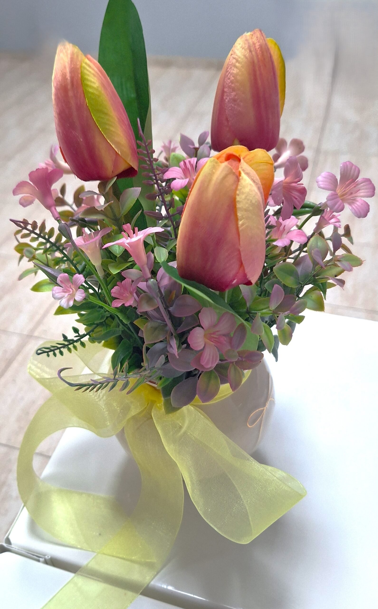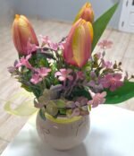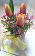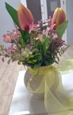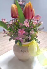 Arreglo de cumpleaños hecha de mano en nuestro taller com flores textiles, eso te durará para siempre. Arreglo es talla grande y colorido, para el deleite de todos los ojos. Dispuesto en un jarrón de derámica.