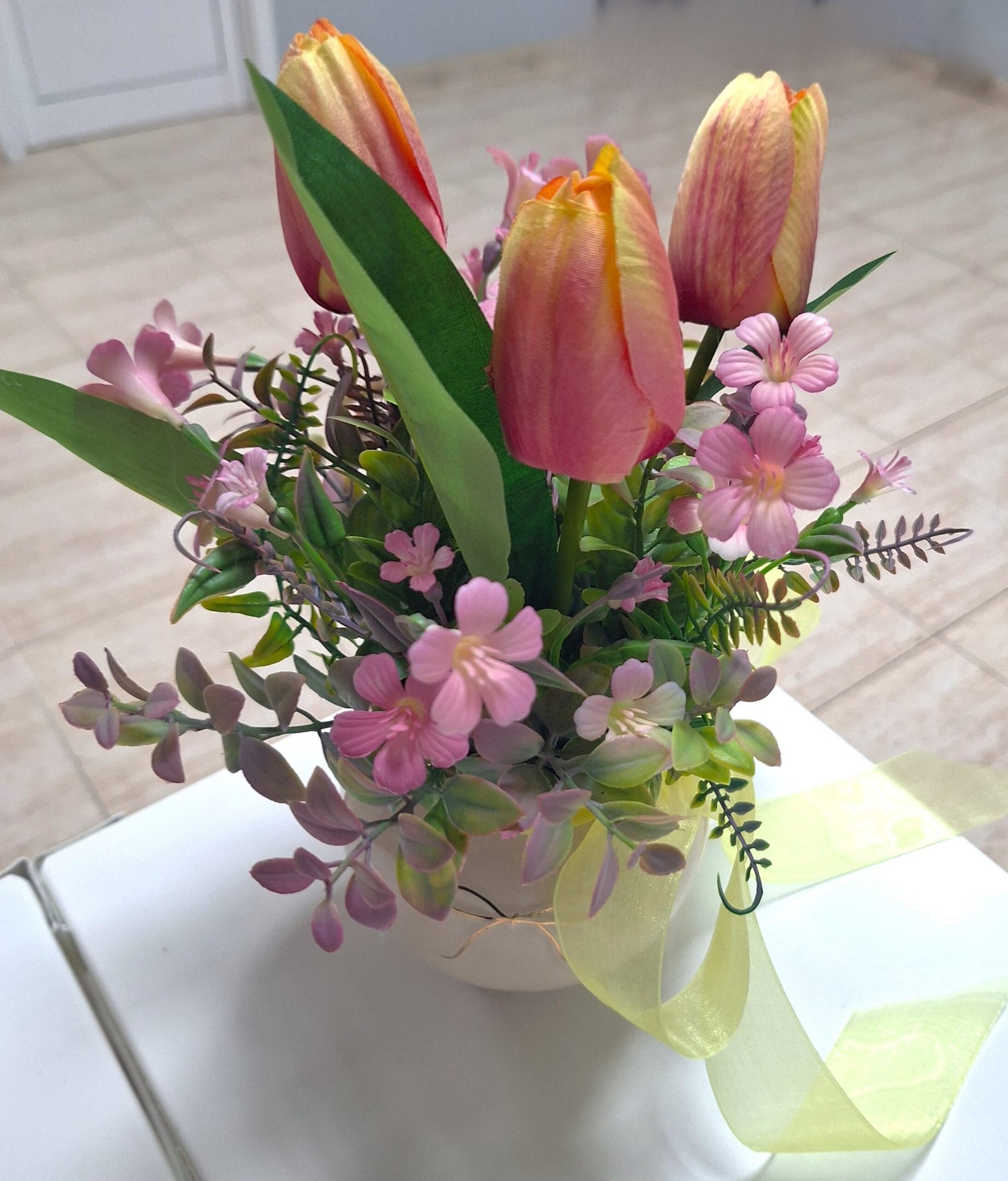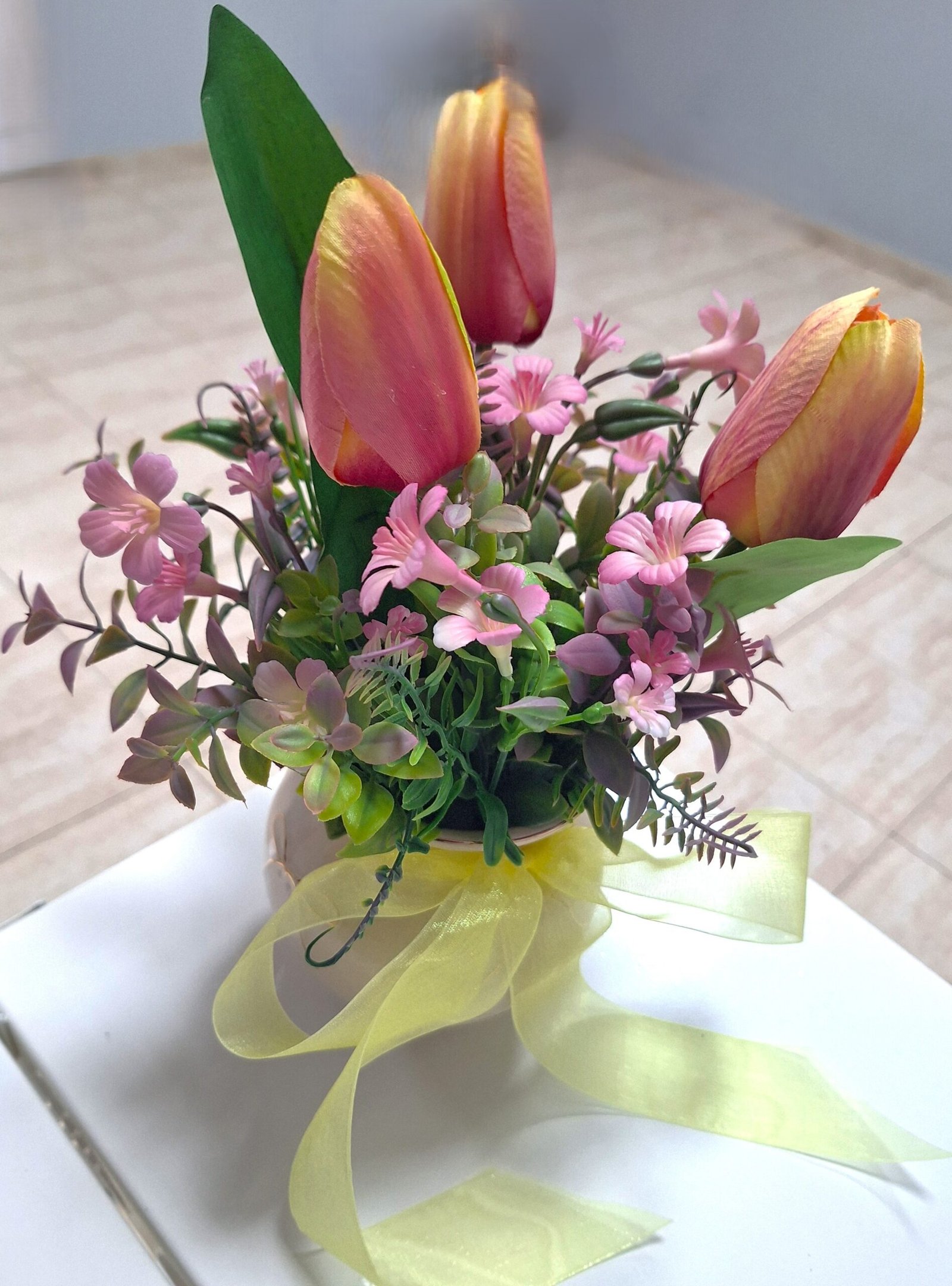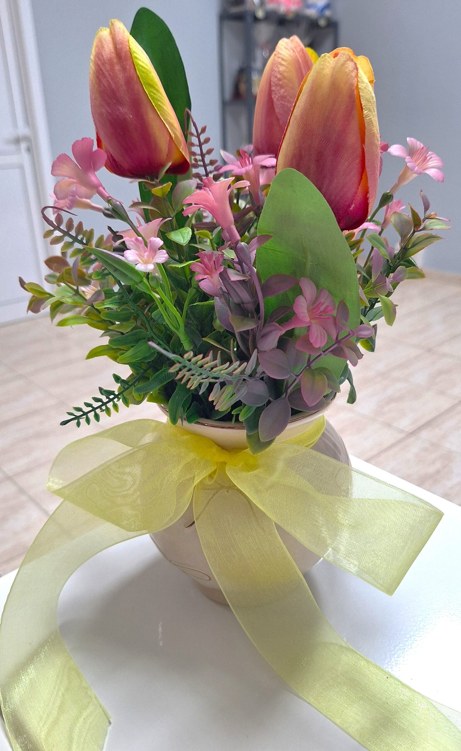 Arreglo de cumpleaños hecha de mano en nuestro taller com flores textiles, eso te durará para siempre. Arreglo es talla grande y colorido, para el deleite de todos los ojos. Dispuesto en un jarrón de derámica.