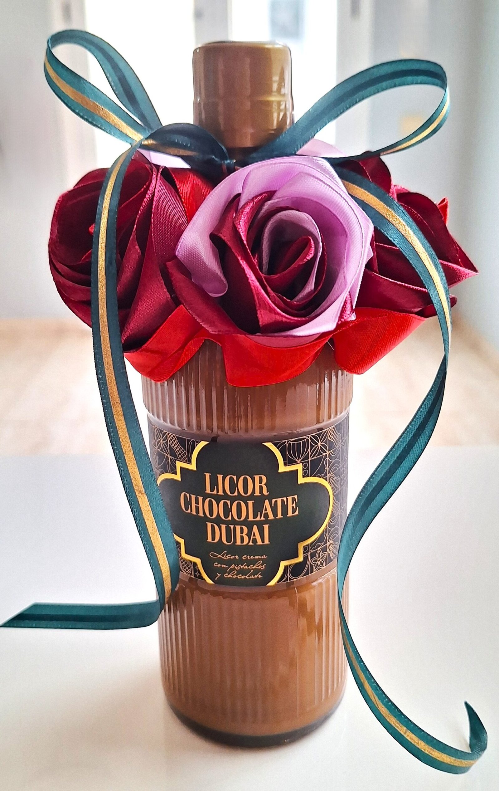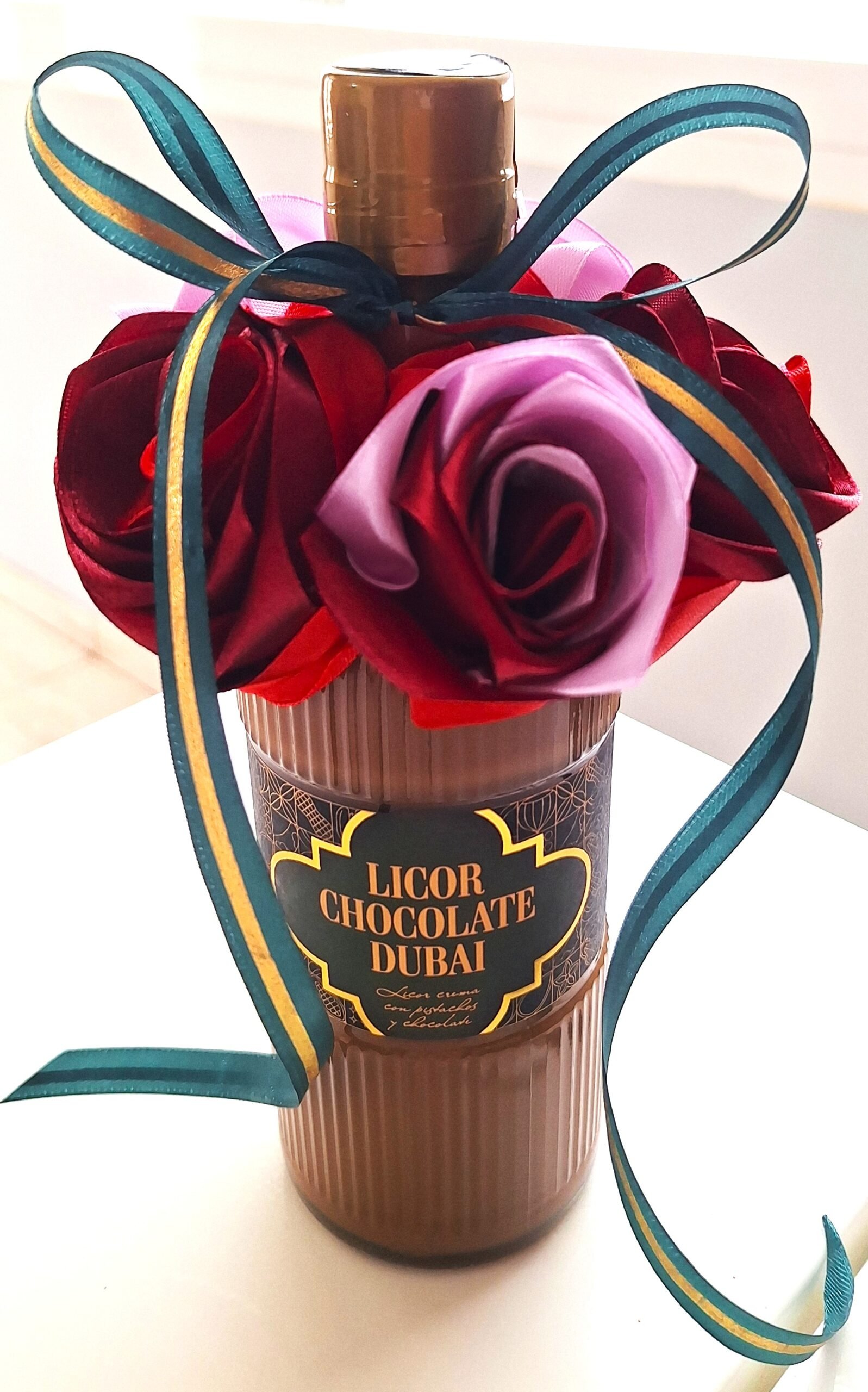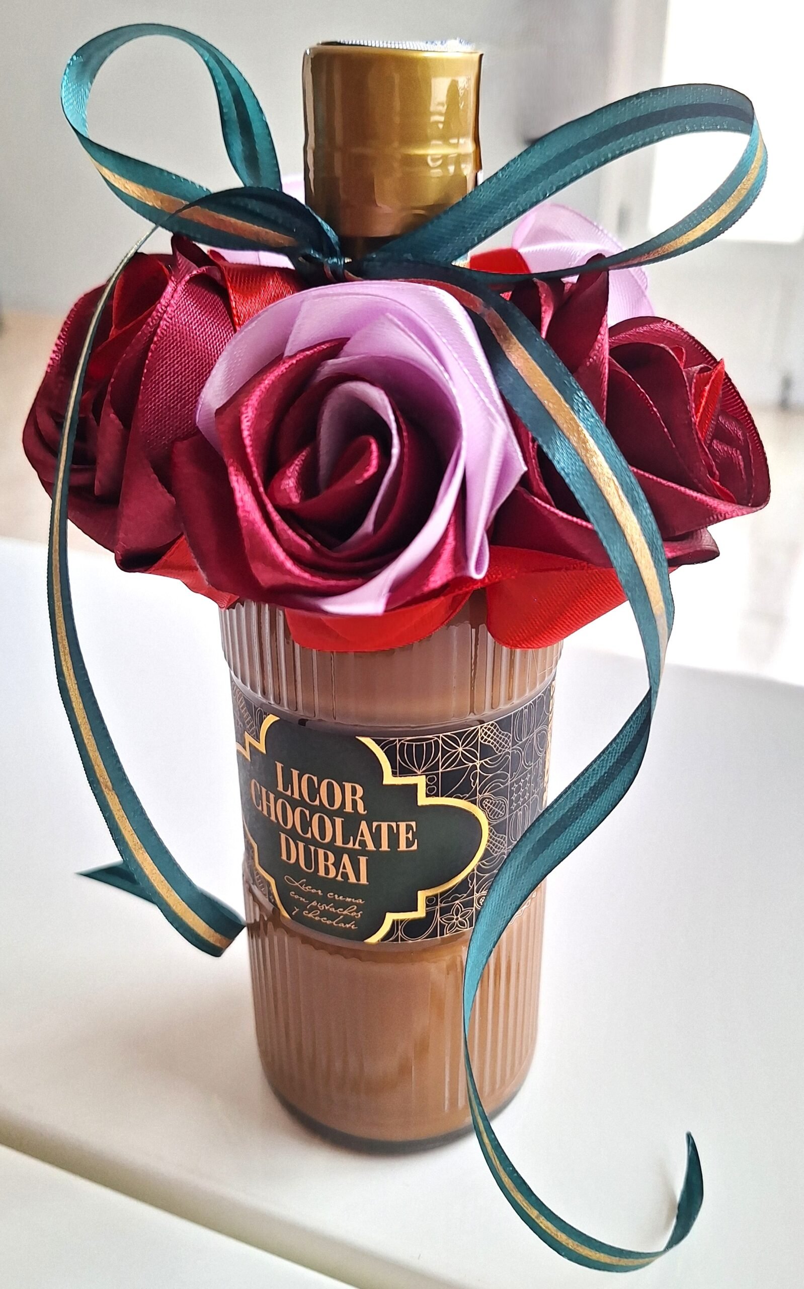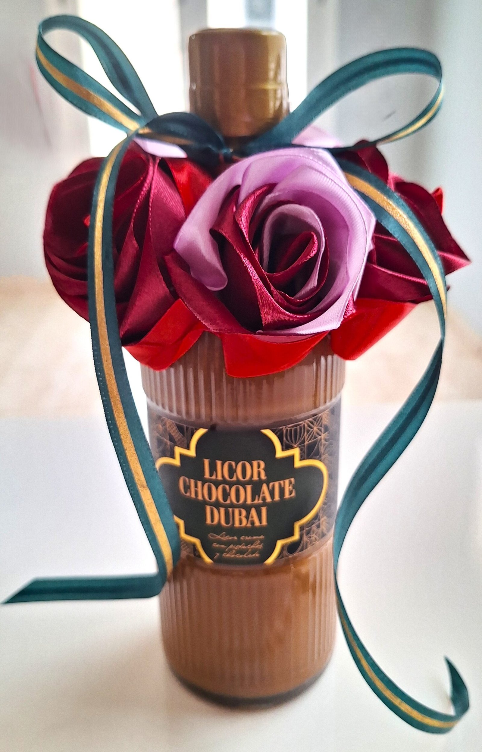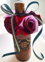 Hermosa botella LICOR CHOCOLATE DUBAI (0,5L) de felicitación, decorada con 5 nuestras rosas, hechos de mano. Rosas son colores mix, botella decorada con cinta verde-oro, para completar el diseño de la celebración.