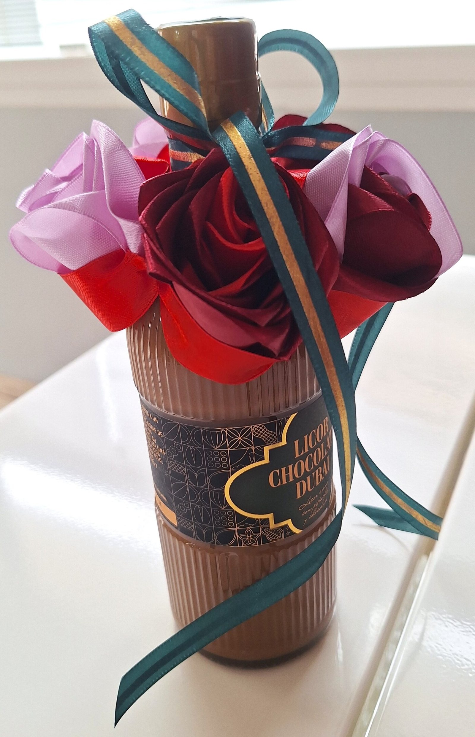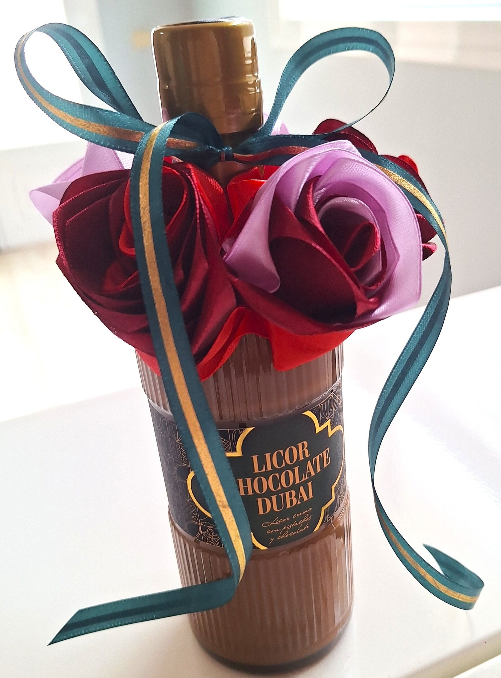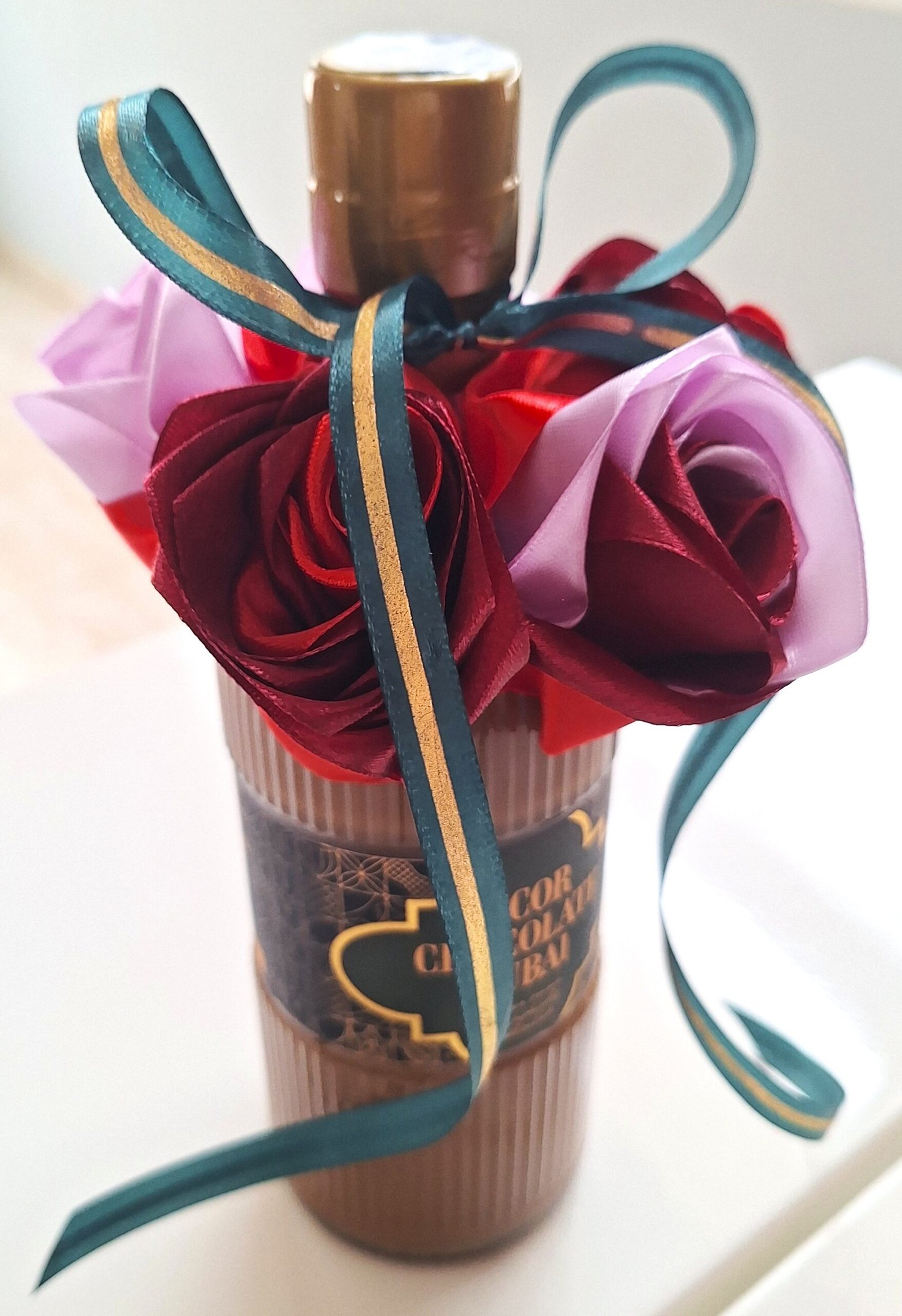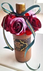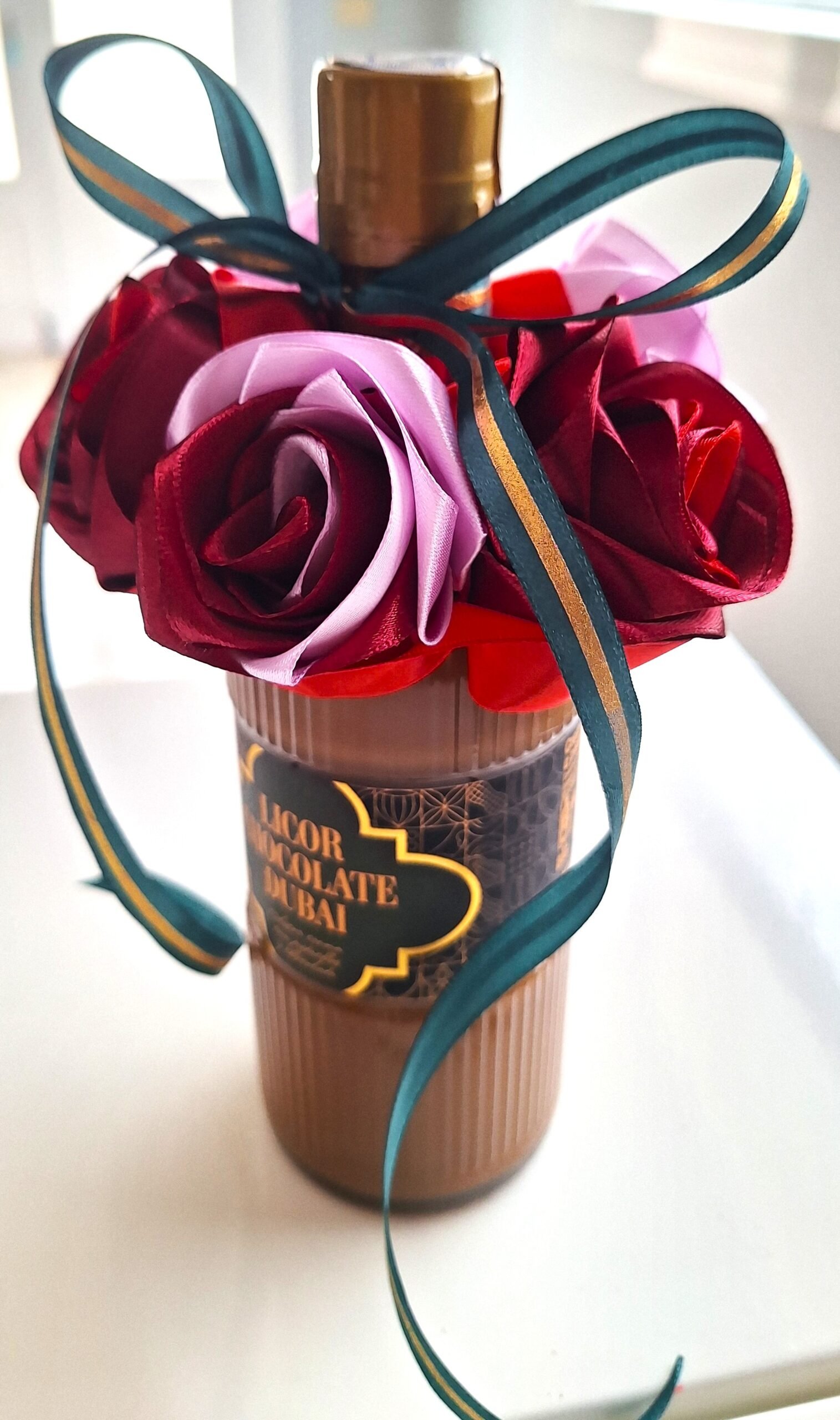 Hermosa botella LICOR CHOCOLATE DUBAI (0,5L) de felicitación, decorada con 5 nuestras rosas, hechos de mano. Rosas son colores mix, botella decorada con cinta verde-oro, para completar el diseño de la celebración.
