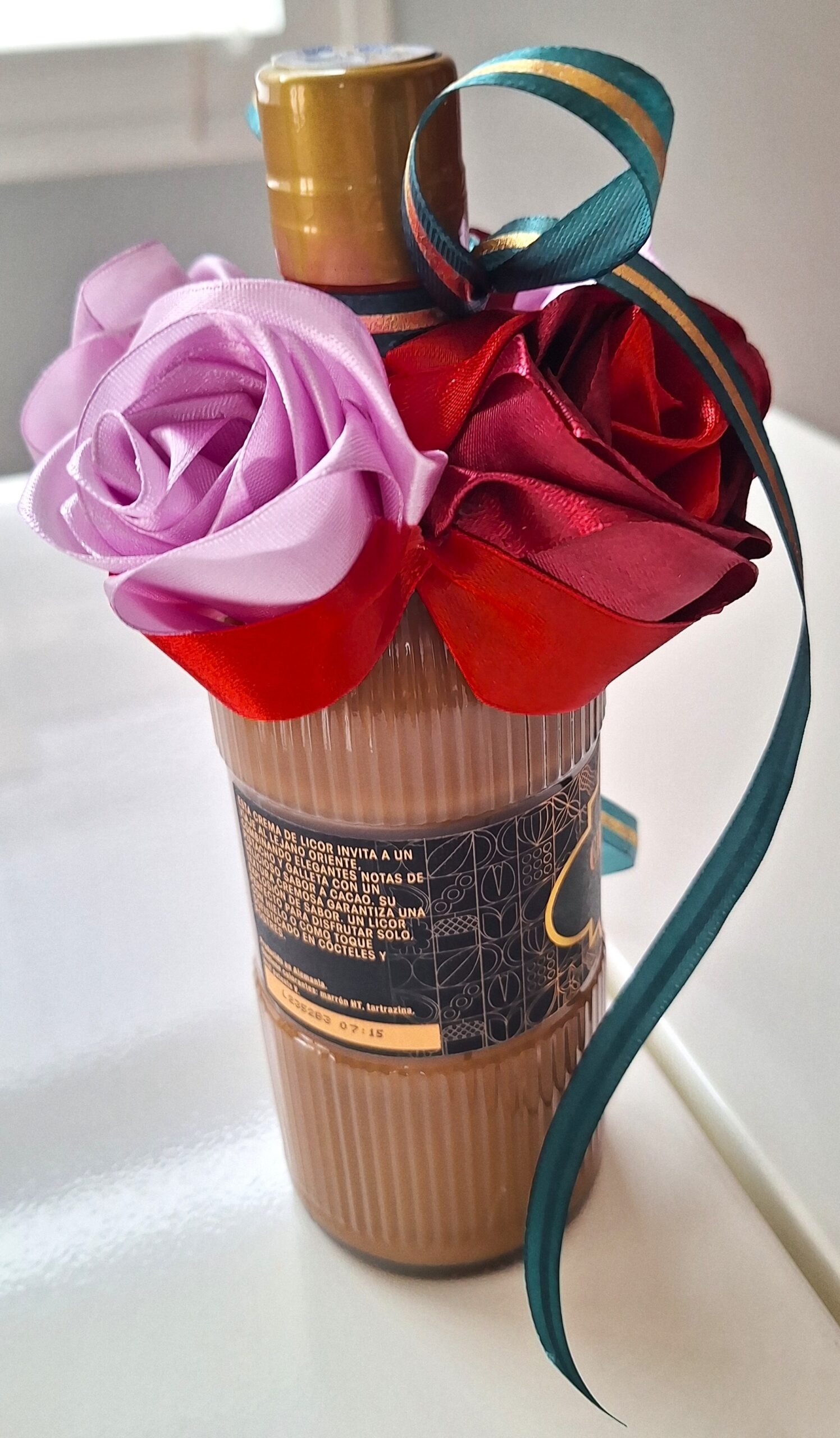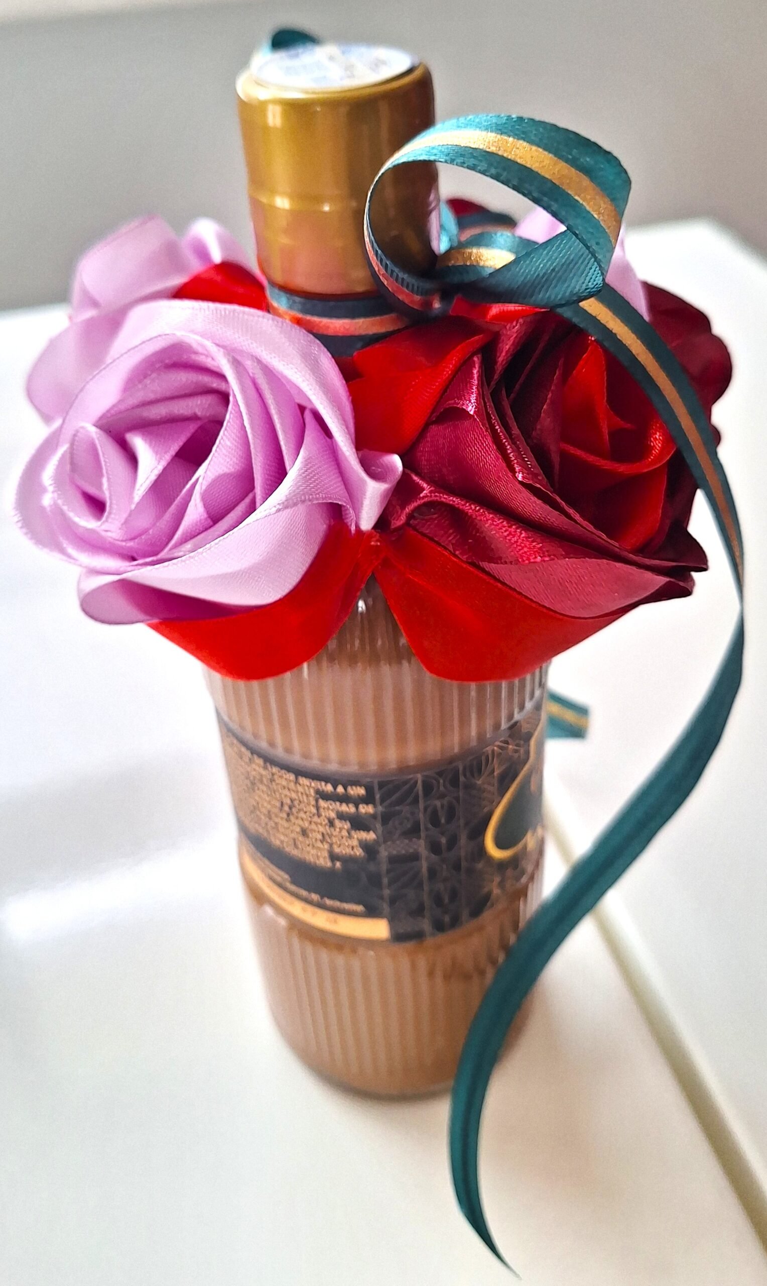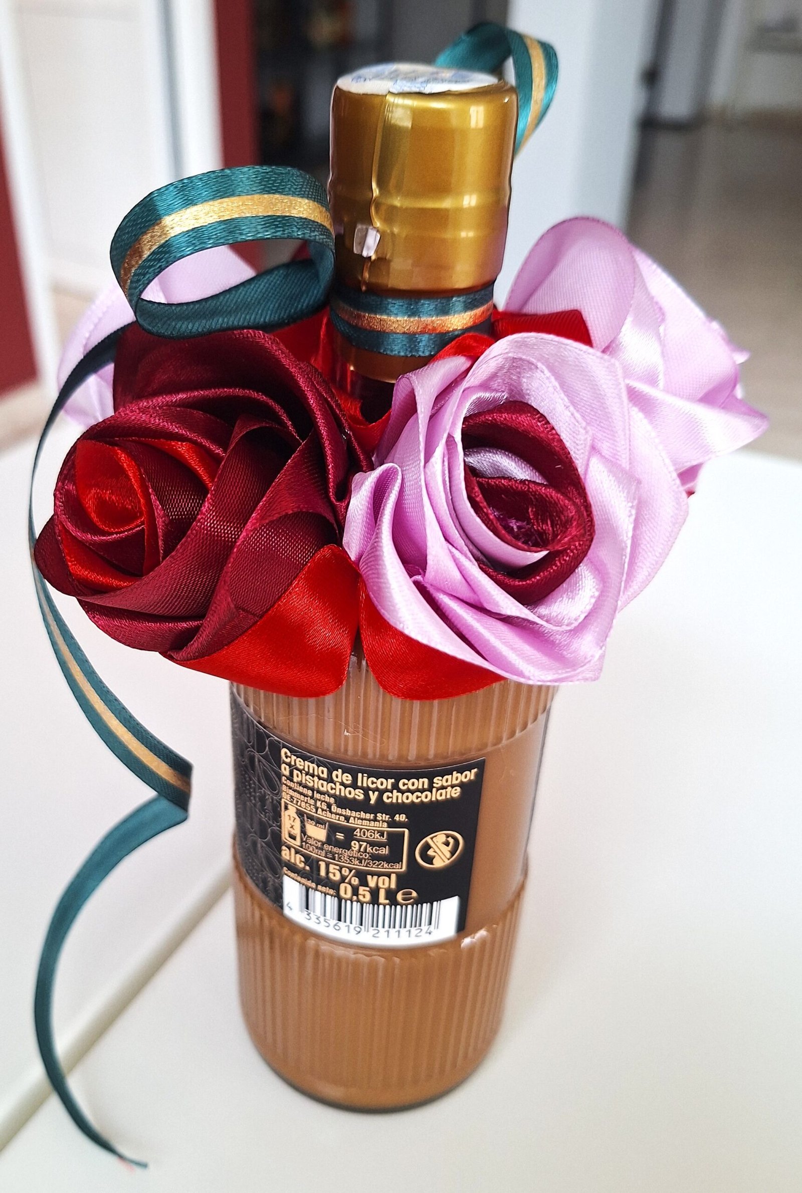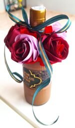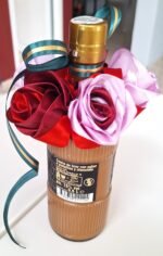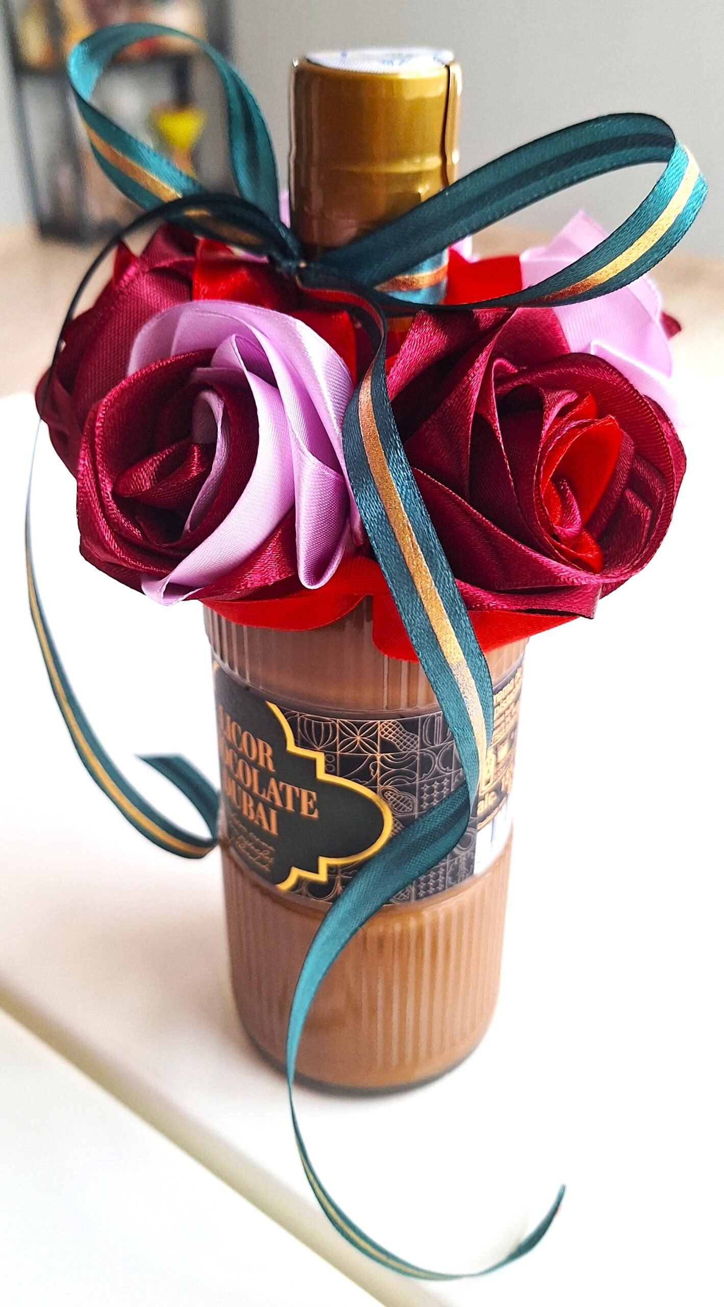 Hermosa botella LICOR CHOCOLATE DUBAI (0,5L) de felicitación, decorada con 5 nuestras rosas, hechos de mano. Rosas son colores mix, botella decorada con cinta verde-oro, para completar el diseño de la celebración.