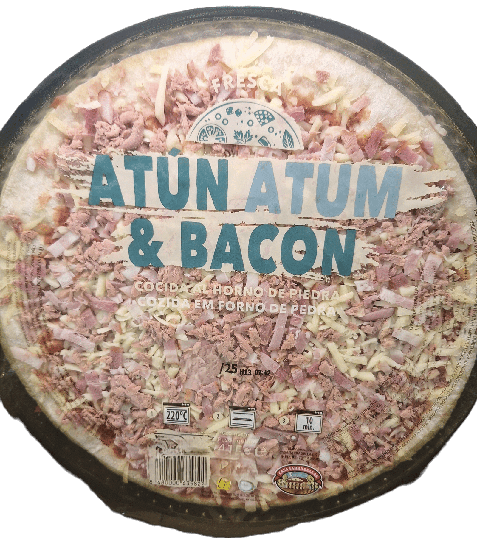 Pizza atún y bacón, cocida al horno de piedra 10min., 220 °C, 415g